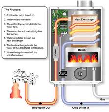 Whether a tank less water heater is point-of-use  or a whole-house unit, they work the same basic way. Cold water enters the unit and is heated by a heating element (heat exchanger) which is turned on by a flow activated switch. The heat exchanger can be electric resistance heating coils or a gas fired burner using natural gas or propane. (Gas units generally have more heating capacity and larger whole-house units are typically gas fired.)